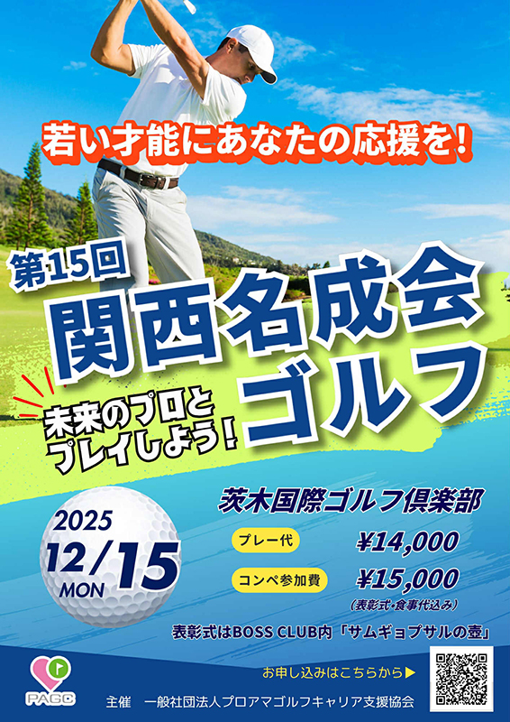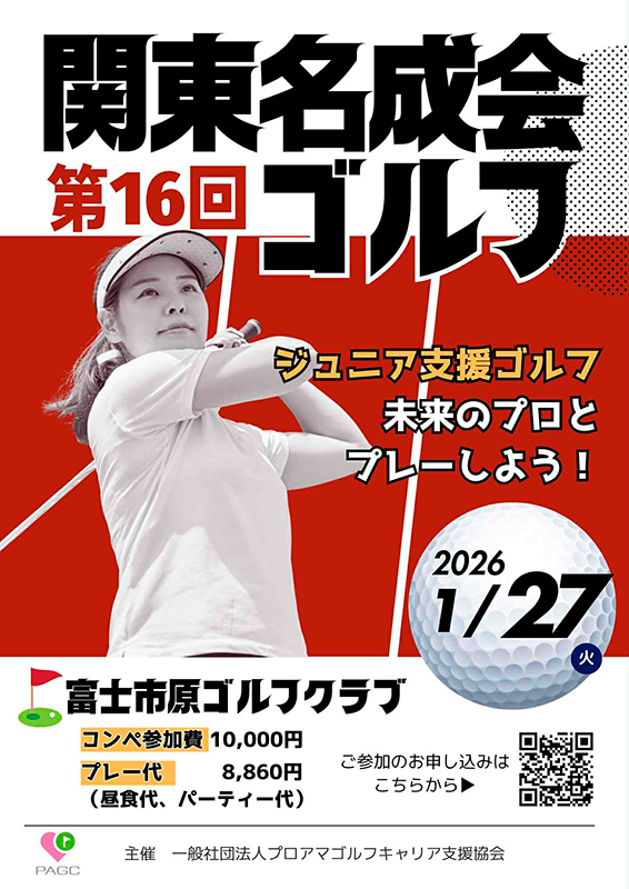 | 2025.12.23 | 第15回関西名成会が開催されました 2025.12.15にジュニア支援コンペ「関西名成会コンペ」が茨木国際ゴルフ倶楽部にて開催されました。 関西で活躍する中学生から今年プロテストを受けたジュニア11人のプレーに参加いただいた方々も応援しながら自身のプレーも楽しんでいただけました。 ![]() |