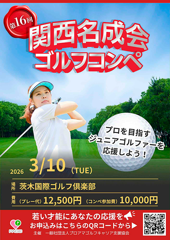 | 2025.12.23 | 第15回関西名成会が開催されました 2025.12.15にジュニア支援コンペ「関西名成会コンペ」が茨木国際ゴルフ倶楽部にて開催されました。 関西で活躍する中学生から今年プロテストを受けたジュニア11人のプレーに参加いただいた方々も応援しながら自身のプレーも楽しんでいただけました。 ![]() |